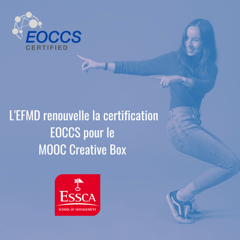 Lancé en 2015 par l’Institut de pédagogie avancée de l’ESSCA School of Management, Creative Box a embarqué plusieurs milliers de participants sur le thème de la créativité au service de l’innovation. Ce MOOC, qui a déjà fait l’objet d’une certification EOCCS en 2017, s’est vu renouveler cette reconnaissance de la part de la Fondation Européenne pour le Développement du Management (EFMD) en 2021, et ce pour une durée de 3 ans.
